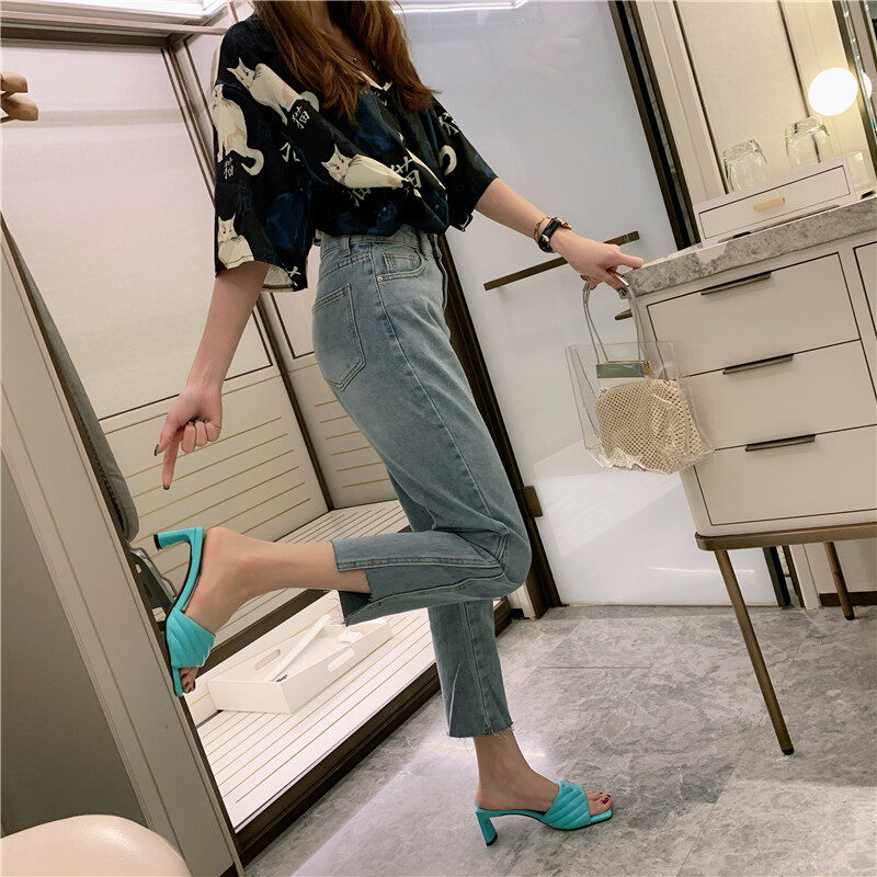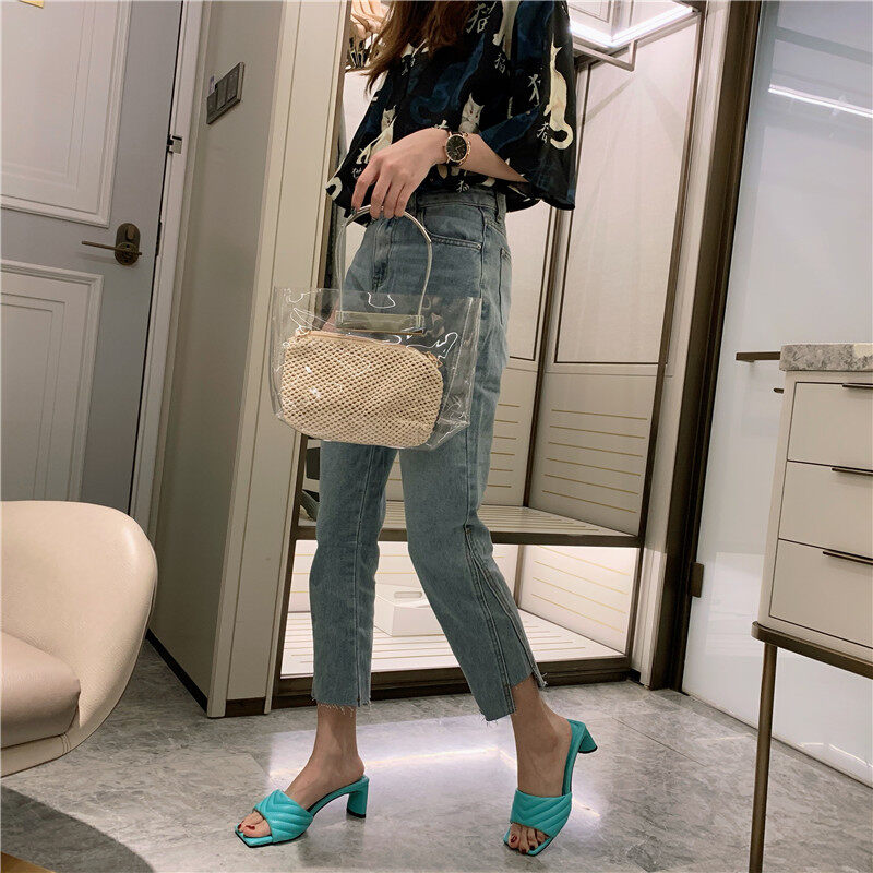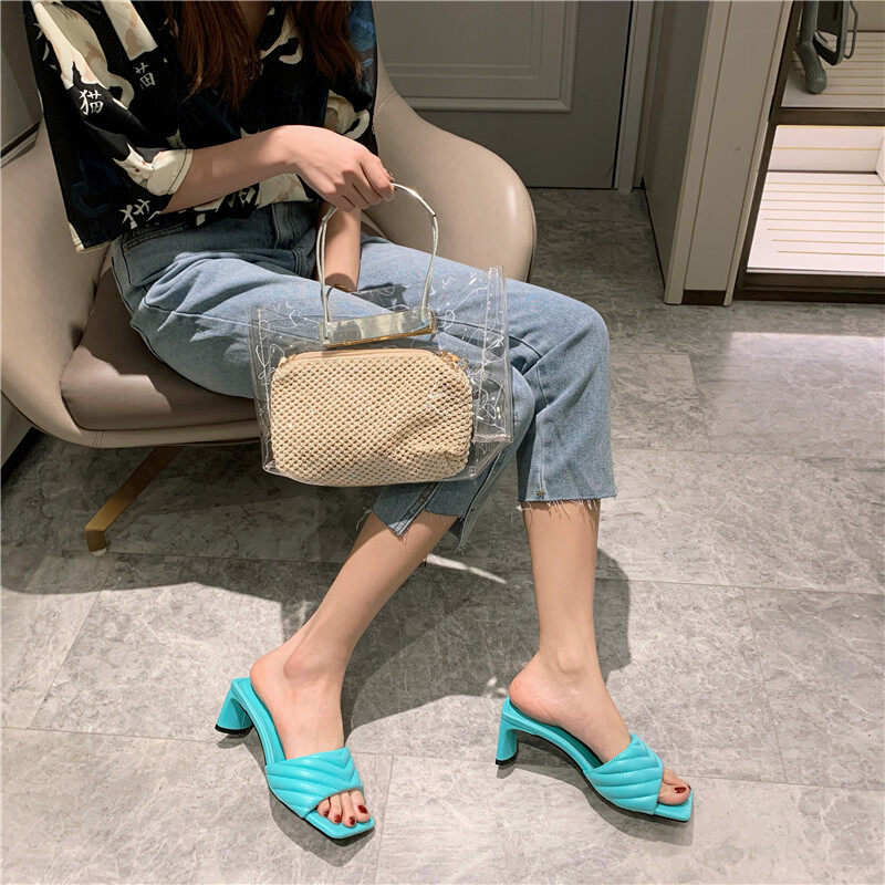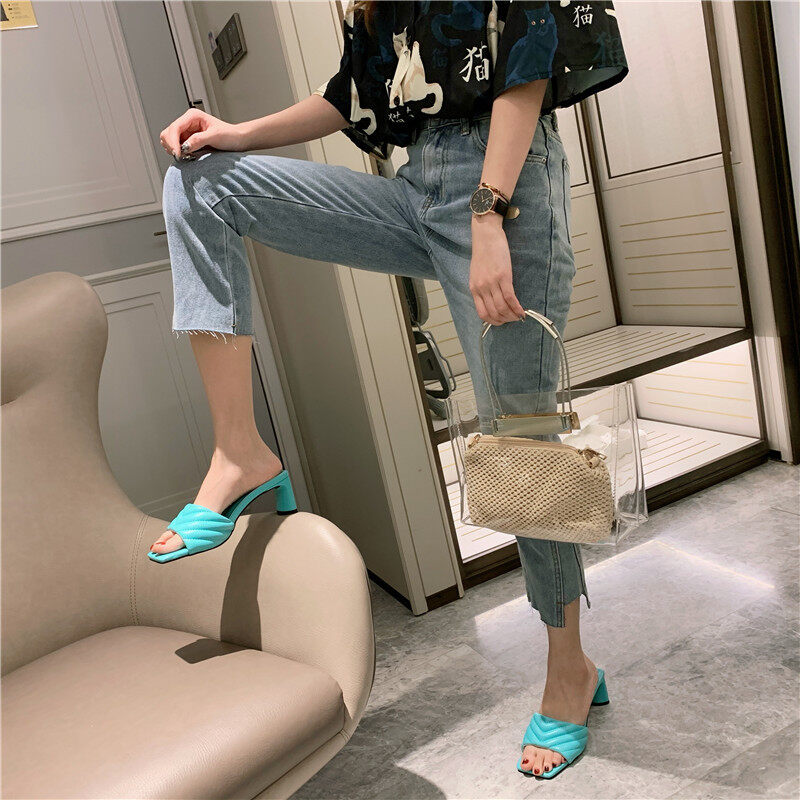 Fashion Elegant Womens Slippers High Quality Solid Cozy PU Leather Square Toe Sandals Femme Low Heel Party Dress Shoes