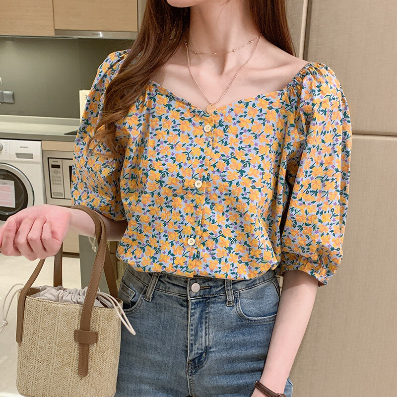 AFEG Floral Print Korean Lantern Short Sleeve Casual Blouse Women Elegant Summer Top Purple Yellow
