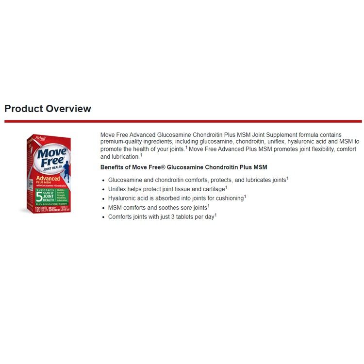Move Free Advanced + MSM is a Glucosamine Chondroitin joint supplement that supports 5 signs of joint health (mobility, flexibility, strength, lubrication and comfort) and provides extra cartilage support so you can do the things you love. Glucosamine is key for the formation of cartilage, an essential building block of your joints to support your mobility and flexibility. Chondroitin is a building block of cartilage that supports joint strength by helping to resist compression in the joint. In the body, Chondroitin functions by attracting fluid to joints to support cushioning and lubrication. Uniflex® (FruiteX-B® Calcium Fructoborate) is a clinically tested mineral complex that supports joint comfort in as little as 2 weeks1. Hyaluronic Acid (HA) is the same molecule found in healthy joint fluid. HA has been reported to support joint lubrication and smooth movement. As we get older, levels of HA tend to decrease. Methylsulfonylmethane (MSM) is a source of sulfur found in the body that is important in the formation of collagen in joints, collagen is a vital part of your joints because it supports the structure of cartilage.*