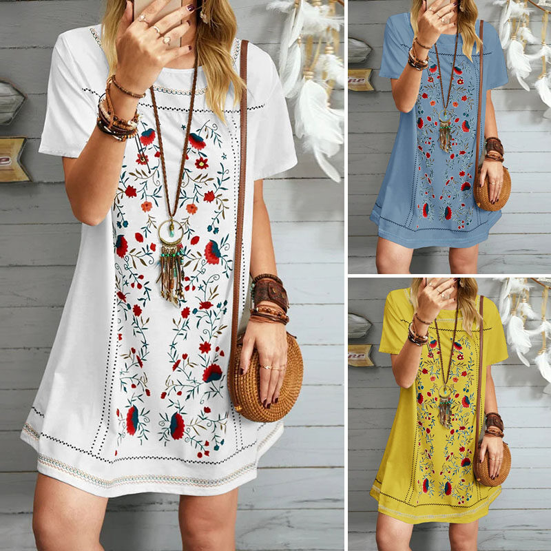 ZANZEA Women Summer Bohemian Floral Printed Short Sleeve Mini Sundress Casual T Shirt Dress