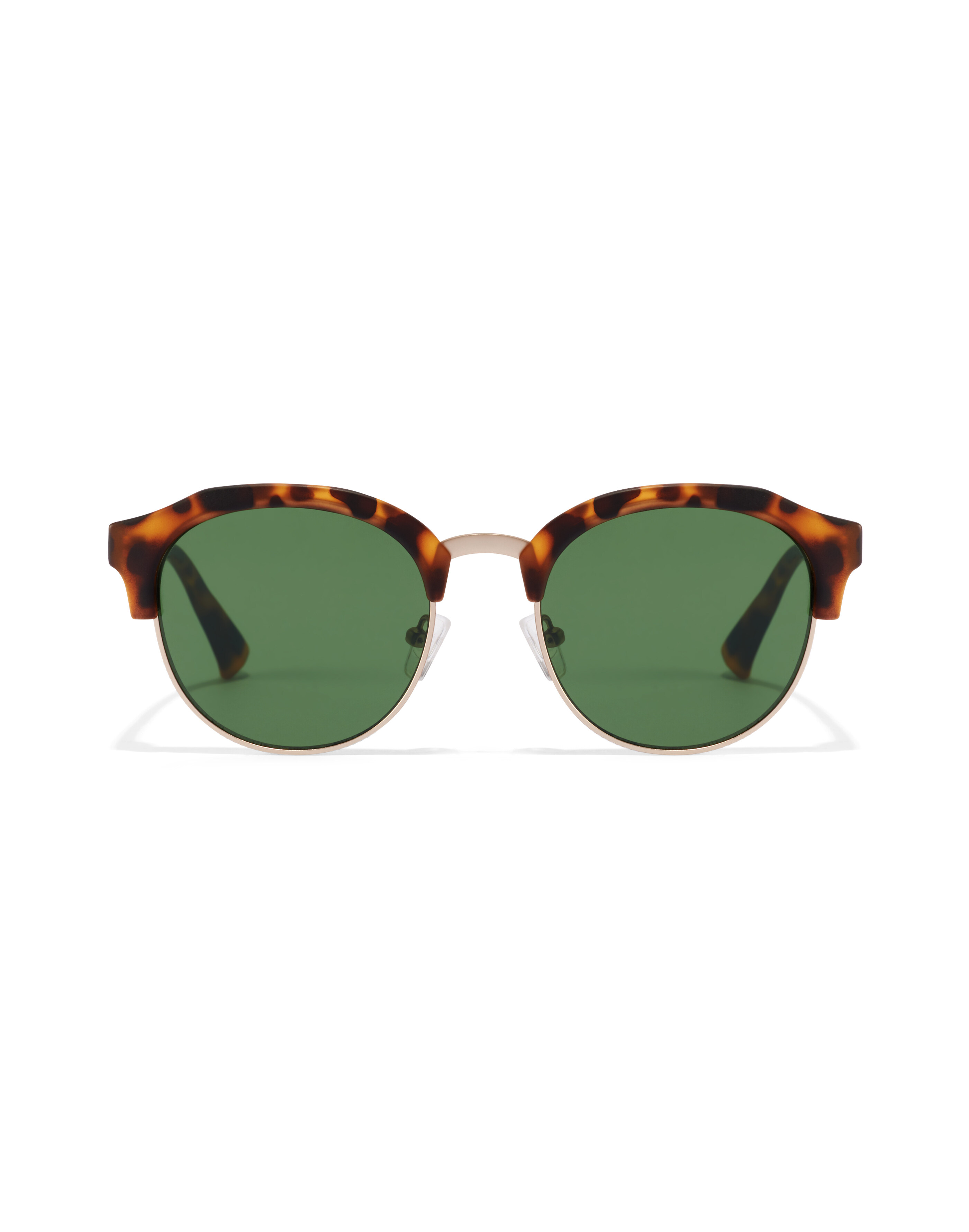 It combines bottle green lenses and round frame in polished Havana print with bridge and gold metal bottom rings.