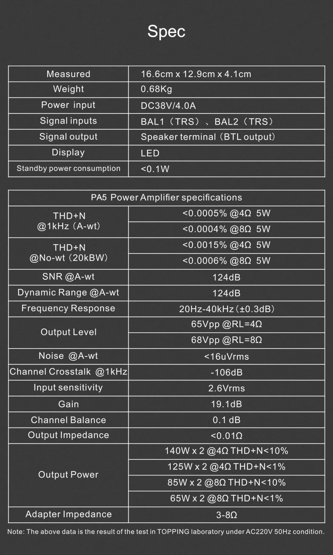 >Topping PA5's professional design enables it to achieve ultra-low THD+N distortion as well as high SNR(signal-to-noise ratio) ratings. The device has <0.0003% THD+N ratings at 8Ω of load. It also achieves 124dB SNR ratings. Both of these reflect the quality performance that PA5 holds within it. If you are looking for a powerful power AMP for your stereo speakers, PA5 will serve you well with its true high-resolution performance.