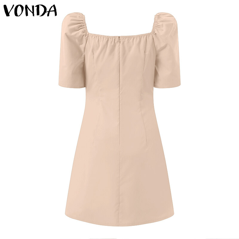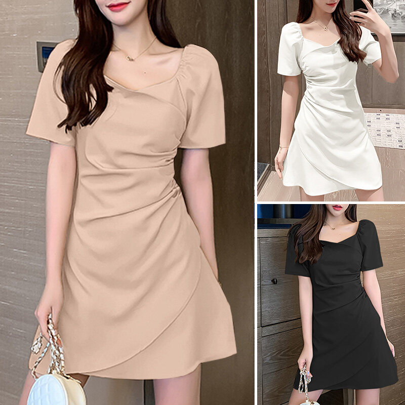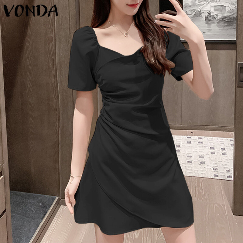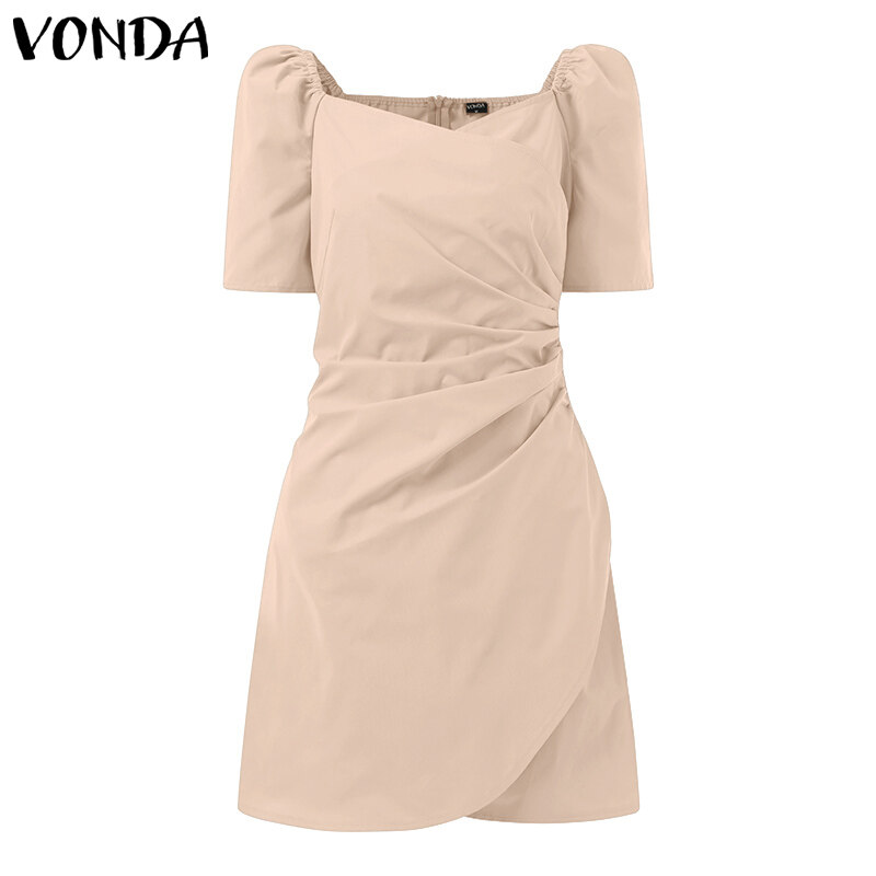 VONDA Women Short Sleeve Solid Color High Waist Skinny Mini Dress Casual Loose Holiday Party Dress (Korean Causal)