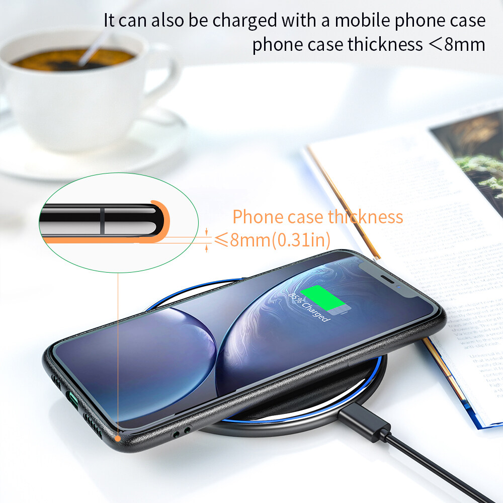 6, with a soft breathing lamp Not dazzling Convenient search for mobile phone charging indicator state is introduced at night (1, wireless charger plugged in the blue light is lit up for 3 seconds and extinguish recharge equipment 2, equipment to charge indicator is blue Blue light when charging is one bright one dark alternate 3 a foreign body, blue indicator flash block or cellphone partial)