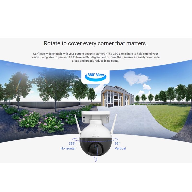 Welcome to EZVIZ Official Store~ We are 100% Singapore in stock, ship within 24 hours of your order! Specifications: ✅Model CS-C8C Lite (1080P) ✅Safty Mark No.:210084-15 ✅Camera -Image Sensor: 1/2.7" Progressive Scan CMOS -Shutter Speed: Self-adaptive shutter -Lens: 4mm @ F1.6, view angle: 87° (Horizontal), 105° (Diagonal) -PT Angle: Pan: 352°, Tilt: 95° -Minimum Illumination: 0.5 Lux @ (F1.6, AGC ON), 0 Lux with IR (data is obtained from EZVIZ laboratories) -Lens Mount: M12 -Day & Night: IR-cut filter with auto switching -DNR: 3D DNR -WDR: Digital WDR -Black & White Night Vision: 30 m / 100 ft. ✅Video & Audio -Max Resolution: 1920 × 1080 -Frame Rate: Max: 30fps; Self-Adaptive during network transmission -Video Compression: H.265 / H.264 -H.265 Type: Main Profile -Video Bit Rate: Ultra-HD; Hi-Def; Standard. Adaptive bit rate. -Audio Bit Rate: Self-Adaptive -Max. Bitrate: 2Mbps ✅Network -Wi-Fi Standard: IEEE802.11b, 802.11g, 802.11n -Frequency Range: 2.4 GHz ~ 2.4835 GHz -Channel Bandwidth: Supports 20MHz -Security: 64/128-bit WEP, WPA/WPA2, WPA-PSK/WPA2-PSK -Transmission Rate: 11b: 11Mbps,11g :54Mbps,11n :72Mbps -Wi-Fi Pairing: AP pairing -Protocol: EZVIZ Cloud Proprietary Protocol -Interface Protocol: EZVIZ Cloud Proprietary Protocol -Wired Network: RJ45 × 1(10M/100M Adaptive Ethernet Port) ✅Storage -Local Storage: Micro SD card slot (Max. 256G) -Cloud Storage: EZVIZ Cloud Storage ✅Function -Smart Alarm: AI-powered human shape detection -Customized Alert Area: Supports -Audio: Supports mic -General Function: Anti-flicker, dual-stream, heart beat, password protection, watermark ✅General -Operating Conditions: -30°C ~ 60°C(-22°F to 140°F ), humidity 95% or less (non-condensing) -IP Grade: Weatherproof Design -Power Supply: DC 12V / 1A -Power Consumption: MAX. 6 W -Dimensions: 158 × 157 × 149 mm (6.22 × 6.18 × 5.87 inch) -Packaging Dimensions: 197 × 185 × 205 mm (7.76 × 7.28 × 8.07 inch) -Net Weight: 510 g (17.99 oz) -Weight (With Package): 885 g (31.22 oz) ✅In the box -Camera (×1) -Power Adapter (×1) -Screw Kit (×1) -Waterproof Kit (×1) -Drill Template (×1) -Regulatory Information (×1) -Quick Start Guide (×1) ✅Certifications -Certifications UL / FCC / CE / WEEE / REACH / ROHS