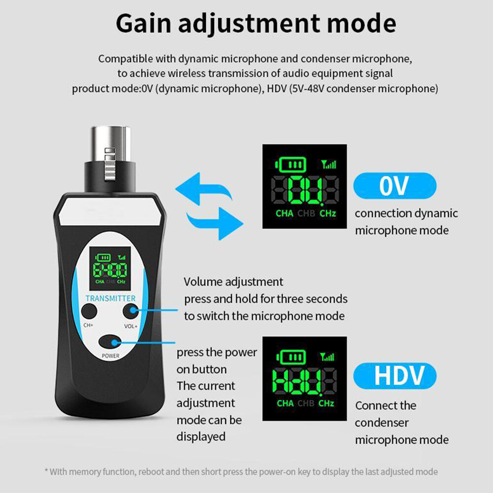 4. HD Display Screen: All information is clear at a glance, and the frequency band and power are displayed in real time. Pay attention to the power in time, which is convenient to use. Highlight the situation of machine switching on and off to prevent forgetting to switch off. Gain adjustment mode is compatible with dynamic microphone and condenser microphone to realize wireless transmission of audio equipment signal. (Product mode: 0V (dynamic microphone), HDV (5V-48V condenser microphone))