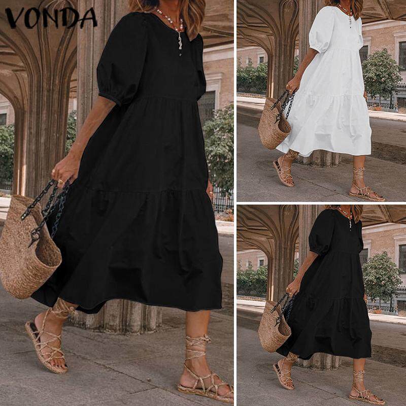 VONDA Women Shirt Dress Elegant Sundress Puff Sleeve Midi Tunic Dress Party Prom Dress (Plus Size)