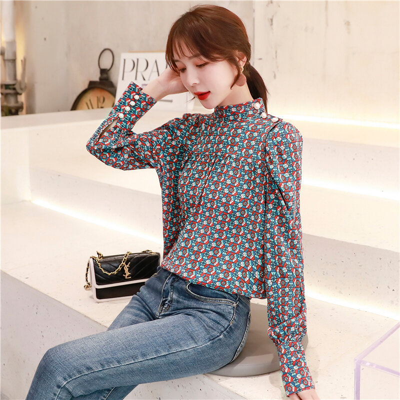 AFEG new Korean Women long sleeve retro print casual fashion wild temperament elegant blouses